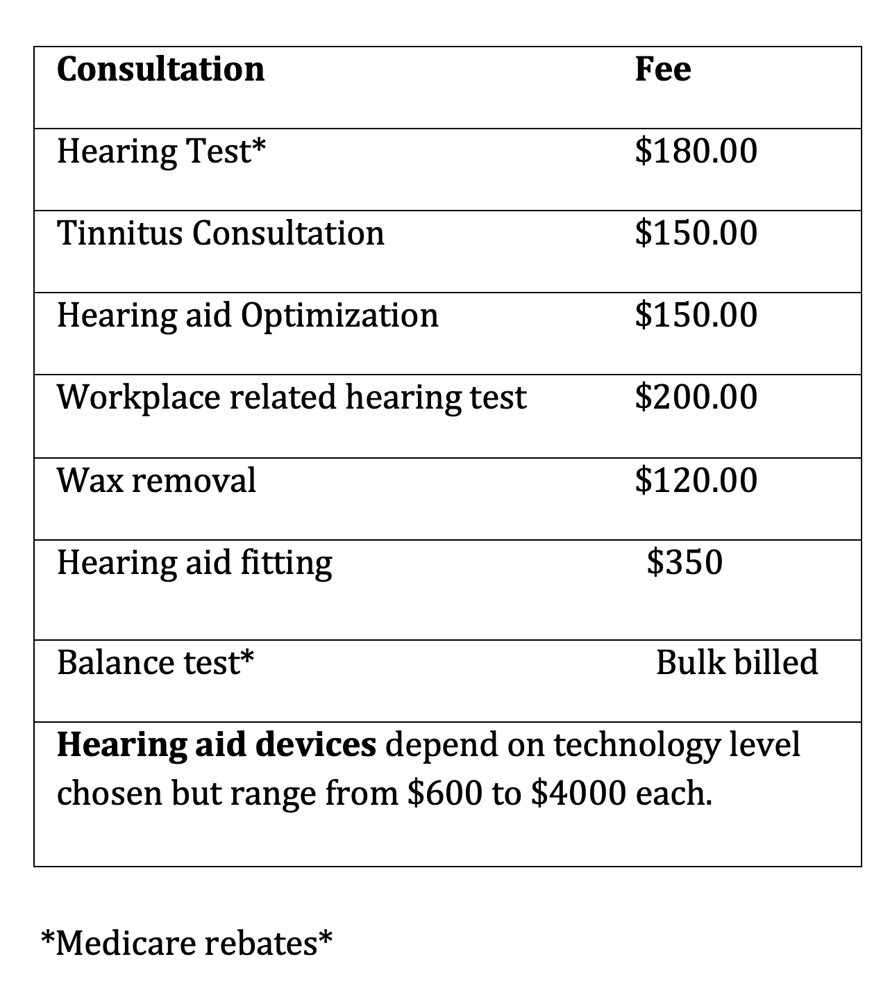 Medicare rebates are available for some audiology tests (noted with *) Our services do incur out-of-pocket payments; however, we can claim the Medicare rebate that applies for your service at the clinic. Please ensure that you provide your Medicare card details prior to your first appointment or bring your Medicare card with you to your appointment and referral.